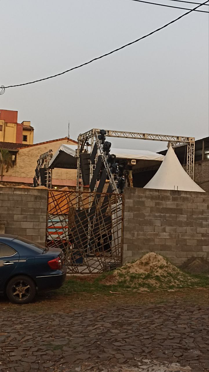 Comenzaron a montar el escenario del concierto al aire libre que está siendo organizado por los dueños de Brooklyn o BKLYN, Paloma Méreles y su esposo Santiago Julián Ortiz Blasser. Lo están haciendo en el patio trasero de la discoteca que tiene como fachada la de un restaurante. Van a generar una tremenda polución sonora, ignorando la Ley 6390 que regula la emisión de ruidos molestos y violando la Constitución Nacional que garantiza el derecho al descanso. Todo esto lo hacen con el apoyo del intendente de Ciudad del Este, Miguel Prieto Vallejos.