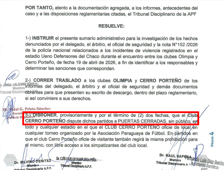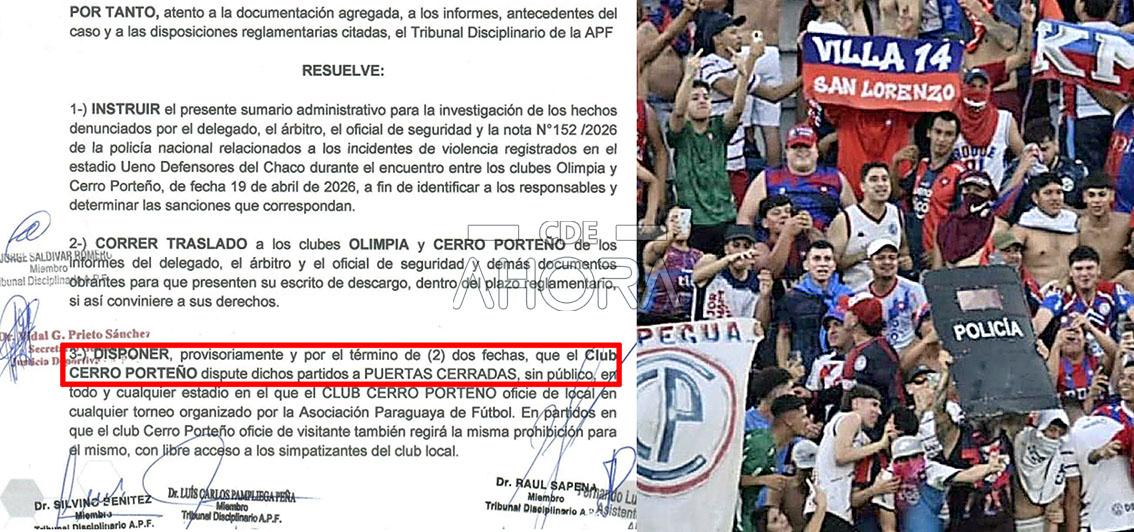 ASUNCIÓN. El Tribunal Disciplinario de la Asociación Paraguaya de Fútbol (APF) emitió su resolución provisoria tras los incidentes violentos registrados en el último superclásico. La medida más drástica afecta directamente a la parcialidad de Cerro Porteño, que tiene prohibido el ingreso a los estadios por los próximos dos partidos oficiales.