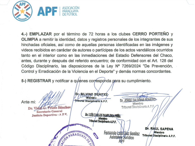 Además de la prohibición de ingreso, la APF ha instruido un sumario administrativo basado en los informes del árbitro, el delegado y la Policía Nacional. Como parte de este proceso, se ha emplazado tanto a Cerro Porteño como a Olimpia a presentar de forma urgente la identidad, datos y registros personales de sus «barras bravas» y de cualquier persona identificada en los actos vandálicos del domingo.