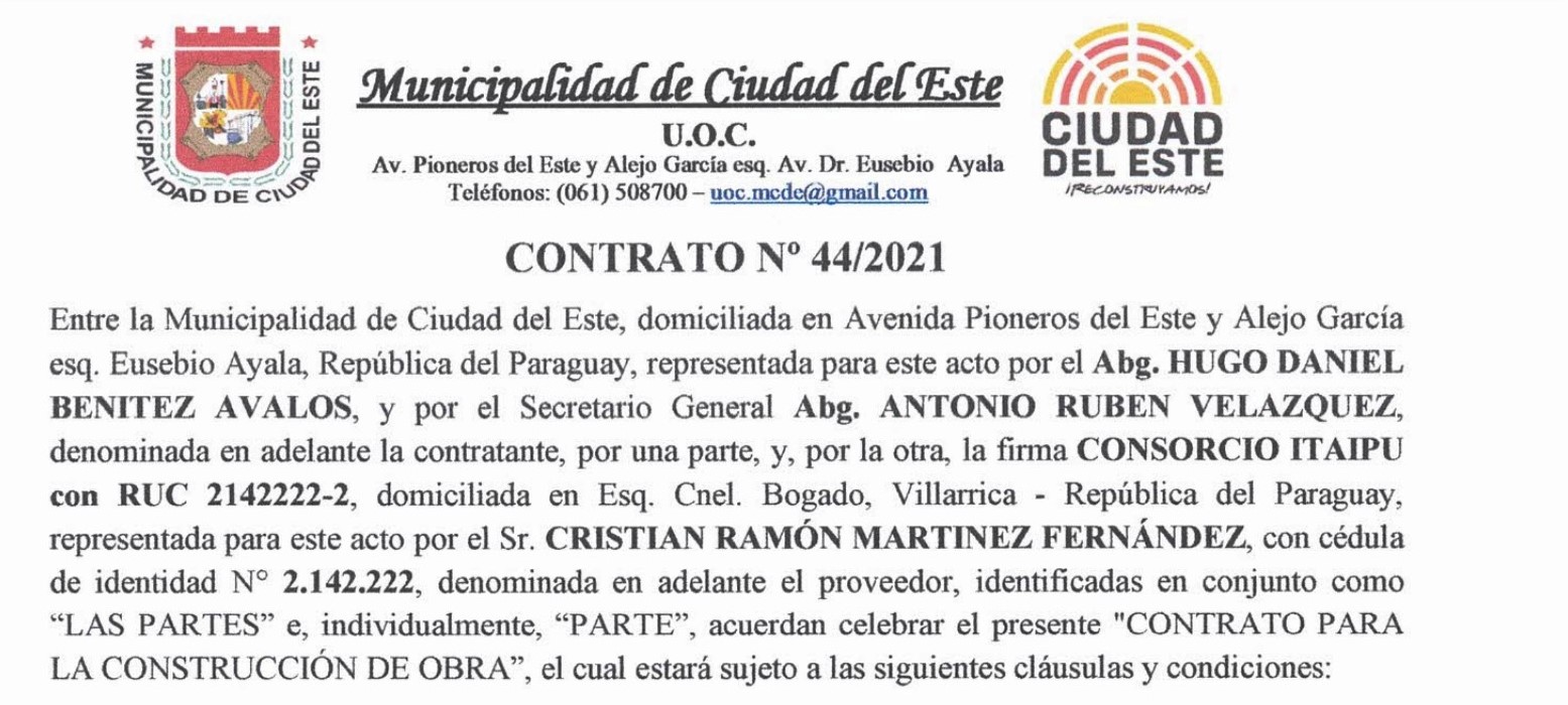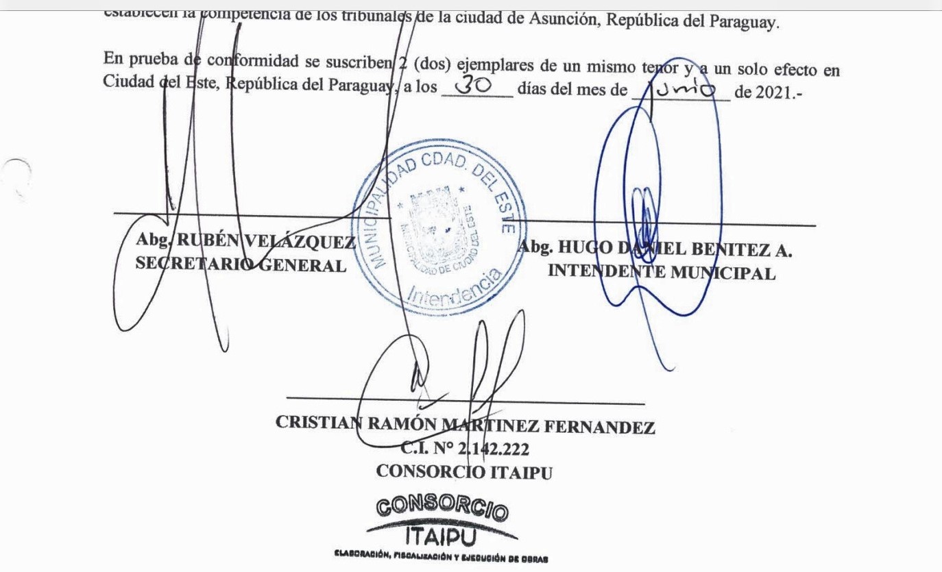 El 30 de junio de 2021, se firmó el contrato entre Cristian Ramón Martínez Fernández del consorcio de maletín, y el intendente Hugo Benítez, el “secre” de Prieto, y actual asesor planillero vip del jefe comunal.