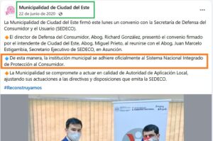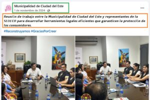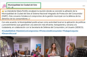 Con muchas fotos en las redes sociales, la intendente interina, la “indigente” María Portillo (PLRA-Clan PRIETO), firmó una vez más un convenio por el cual la comuna esteña se adhiere al Sistema Nacional Integrado de Protección del Consumidor (SNIPC). El acuerdo lo firmo con la Secretaría de Defensa del Consumidor y el Usuario (SEDECO). Esto mismo lo hizo en 2020 el exintendente, Miguel Prieto Vallejos, destituido por corrupto; lo ratificaron en 2024, cuando era presidente y fungía de intendente, Víctor “viático” Torales. Lo que falta es aplicar el acuerdo, cosa que nunca se hizo, y eso que está en vigencia 5 años. Dejen de joder y trabajen.