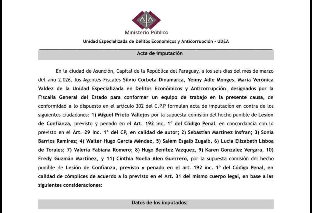Este viernes 6 la Fiscalía imputó al ex intendente Miguel Prieto Vallejos, destituido por corrupción, y a otras 10 personas por presunta lesión de confianza. El Ministerio Público imputó al intendente de Ciudad del Este, Miguel Prieto.