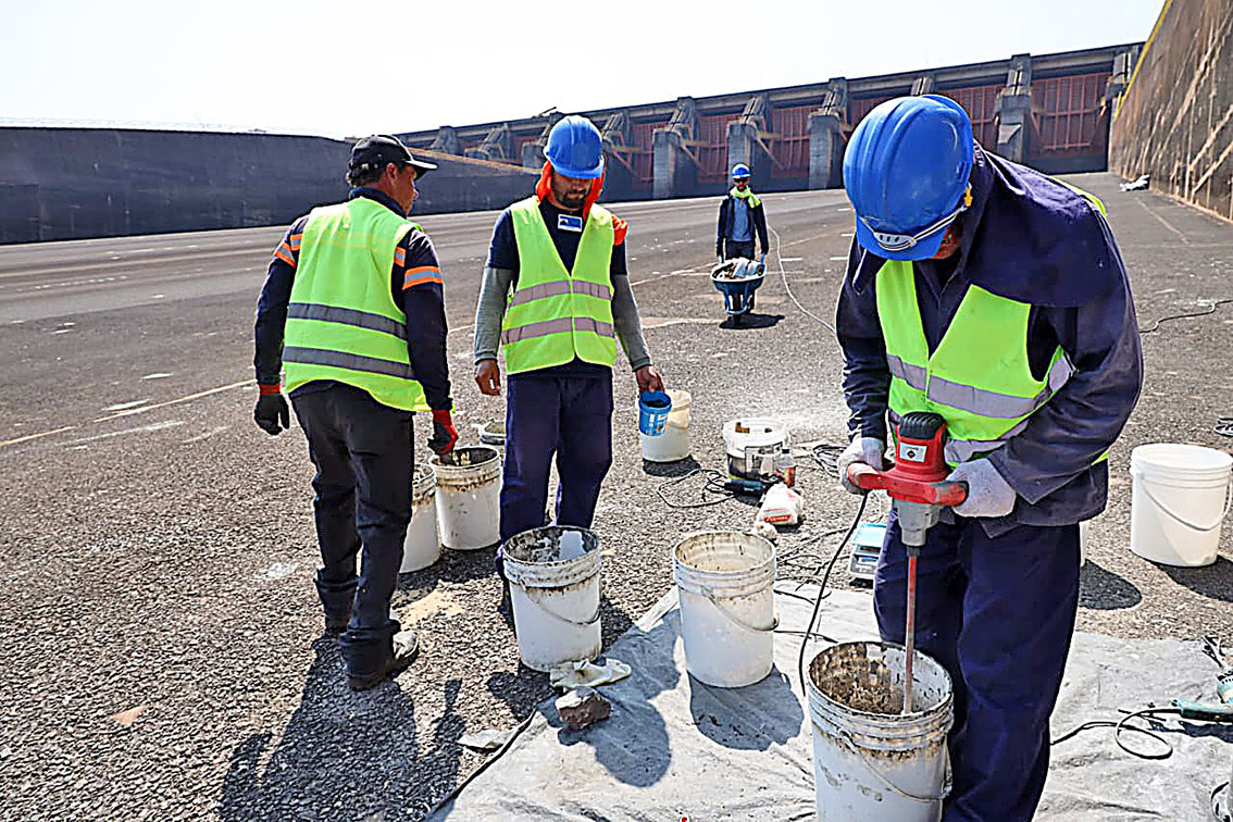 Culminaron los trabajos de mantenimiento en la superficie hidráulica y muro del canal izquierdo del vertedero de la Central Hidroeléctrica ITAIPU (CHI), en Hernandarias. Se trata de una importante tarea cuyo objetivo fue reparar los daños causados por la erosión y cavitación que se generan en periodos de vertimiento de agua desde el embalse, a lo largo de los años.