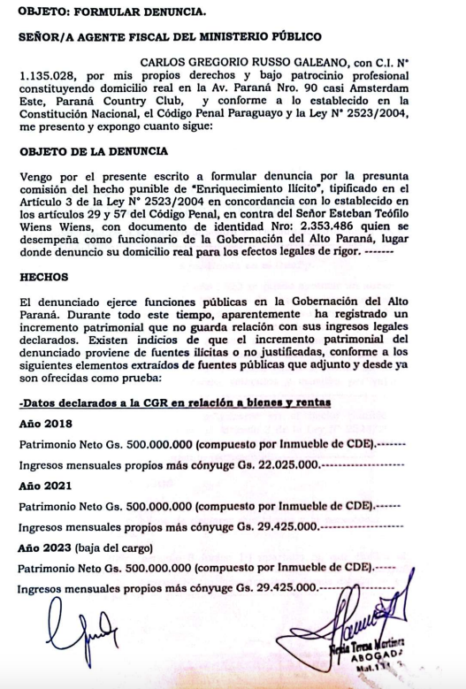 El abogado Carlos Russo Galeano presentó una denuncia ante el Ministerio Público contra Esteban Teófilo Wiens, quien es funcionario de la Gobernación de Alto Paraná, hijo del exministro y candidato presidencial Arnoldo Wiens.
