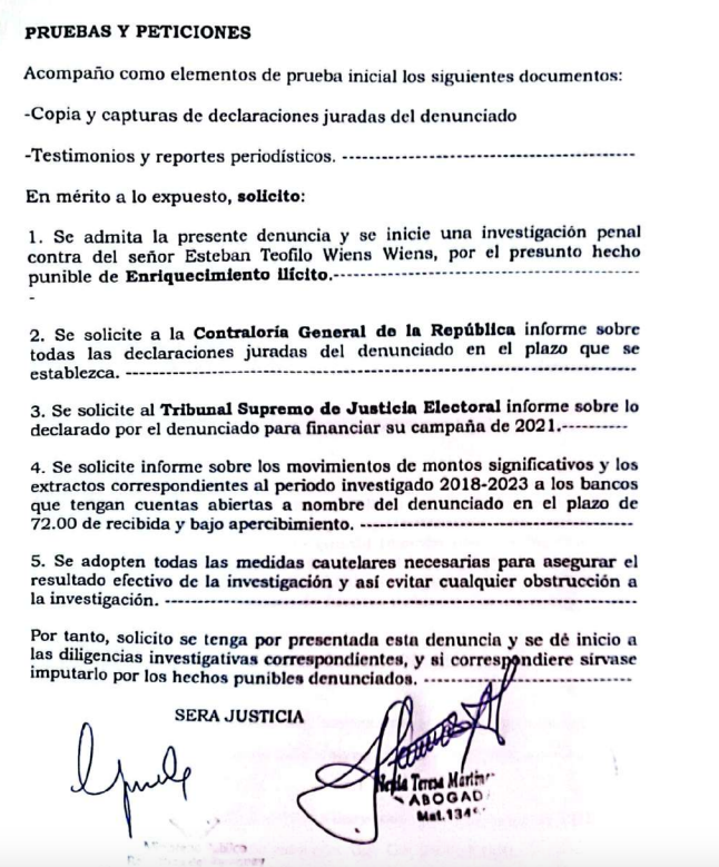 En su denuncia, el abogado Russo solicita que la Contraloría General de la República informe al Ministerio Público de las declaraciones juradas de Wiens y, además, que la Justicia Electoral detalle lo declarado por el denunciado para financiar su campaña política en el año 2021.