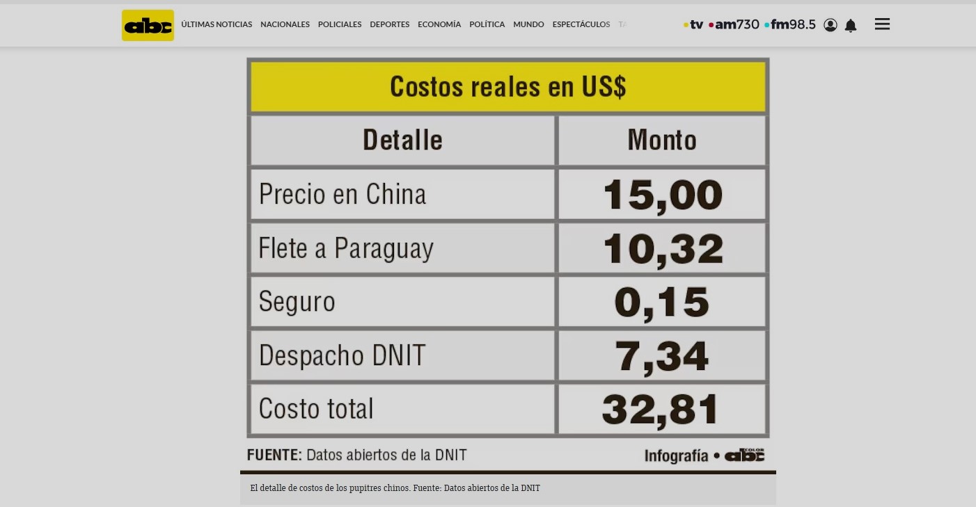 El diario ABC Color divulgó que el costo para traer los muebles de China Popular es poco más de 17 dólares por cada uno. La información la obtuvo junto a la Dirección Nacional de Ingresos Tributarios (DNIT).