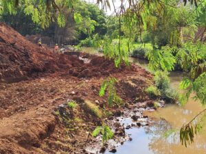 En las imágenes se puede ver la gran cantidad de tierra y escombros, restos de material de construcción, que están siendo arrojados al lecho del arroyo Amambay. Esto es un grave daño ambiental. No están respetando la franja de 15 metros de protección del cauce hídrico como establece la ley en la República del Paraguay.