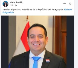 La concejal rastrera, María Portillo Verón (PLRA), envió un mensaje a Miguel Prieto Vallejos, exintendente destituido por corrupto y aspirante a la presidencia. “Próximo presidente de la República, Ricardo Estigarribia”, quien es actualmente gobernador de Central y aspirante liberal a la presidencia. No se sabe si estos “mensajes” en las redes sociales ya son una decisión de Portillo, o son más bien extorsivos para que Prieto y sus secuaces cedan a alguna pretensión de la misma y su hermano Carlos Portillo. En la tarde de este jueves 4 se anunciaría oficialmente la alianza.