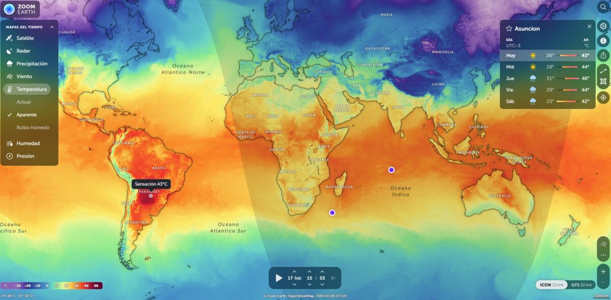 Como puede observarse en imágenes satelitales que captan las temperaturas, Paraguay fue este martes el punto más caliente de la Tierra, con sensaciones térmicas que en algunos lugares llegaron a los 47°C entre las 12:00 y las 16:00 horas.