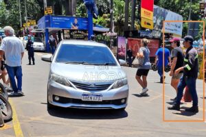 Dos funcionarios de la Dirección Municipal de Transporte Público, quienes están debajo de un toldo naranjado de la municipalidad de Ciudad del Este, son los encargados de controlar quiénes entran en la avenida Monseñor Rodríguez, en su intersección con la avenida Carlos Antonio López.