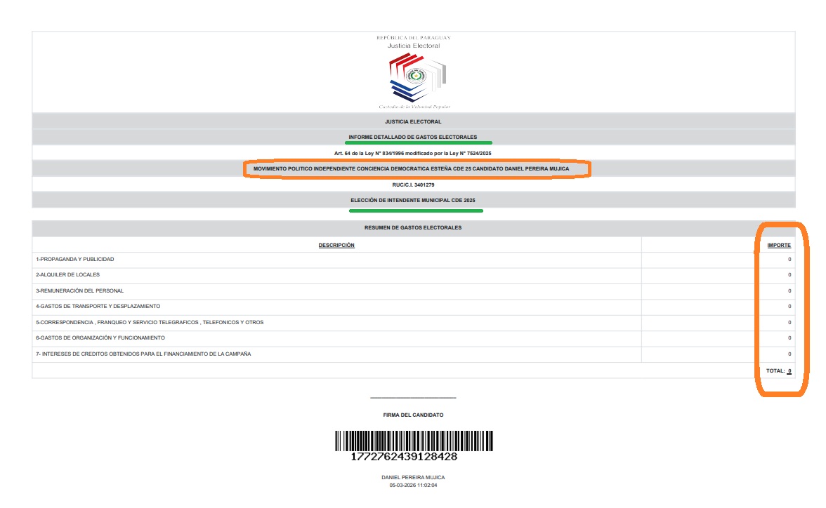 El dato es oficial y está en la página web de la Justicia Electoral. Pero sin duda sorprende que Dani Pereira Mujica haya gastado cero guaraníes en su campaña política para las municipales complementarias de 2025. Si tenemos en cuenta esto, Pereira Mujica no tuvo una sola calcomanía, una banderita, una remera, un kepi, nada de carteles, ni siquiera un papelito con su nombre, nada de nada; quiere decir que ni siquiera se fue a votar. Pero sí ganó las elecciones de forma aplastante a Roberto González Vaesken, el fan de Miguel Prieto.