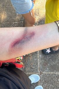 No vamos a llegar a un arreglo para que se solucione, siendo que mi señora fue la más afectada; mira cómo quedó su brazo, boca y el auto. Le mostró el auto y este señor pensó que era solo la parte de afuera, donde está la señora Tamy, lo que muestra en la foto que ella tiene, pero al abrir el auto mi marido y mostrarle a este señor, se asusta por lo que parece y peor exige para que le haga los apuntes del juzgado de faltas, que vamos a llamar a la gente del PMT y así. Yo no sé si se asustó al ver que mi auto es nuevo y el impacto que tuvo, o por los gastos; por eso no quiso hacerse cargo en el momento.