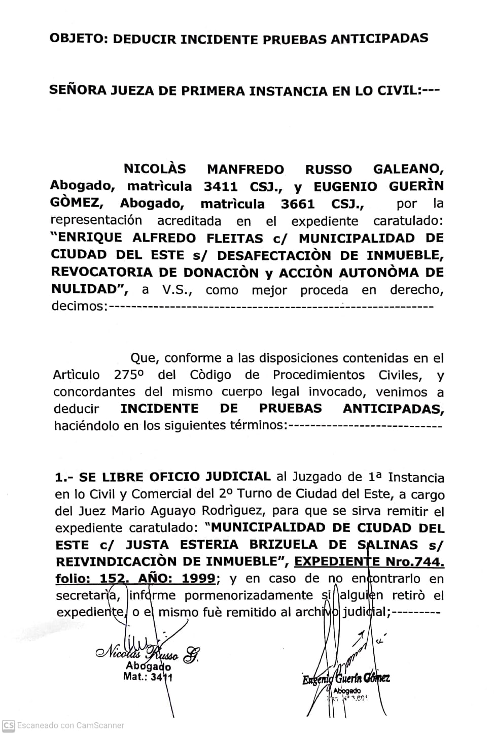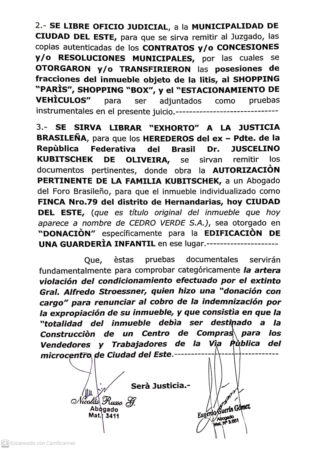 Los Abogados de Enrique Fleitas (único hijo biológico del Gral. Alfredo Stroessner, y que fuera reconocido legalmente), solicitaron al Juzgado de Primera Instancia que atiende el caso de desafectación de la ley de expropiación del inmueble de las 7 hectáreas (parte de las 9 hectáreas) que está en la cabecera del Puente de la Amistad de Ciudad del Este, para que libre un Exhorto Judicial a la Justicia de la República Federativa del Brasil, a los efectos de que los HEREDEROS del ex – Presidente de la República Federativa del Brasil Dr. JUSCELINO KUBITSCHEK DE OLIVEIRA, se sirvan remitir los documentos pertinentes, donde obra la AUTORIZACIÒN PERTINENTE DE LA FAMILIA KUBITSCHEK, a un Abogado del Foro Brasileño, para que el inmueble individualizado como FINCA Nro.79 del distrito de Hernandarias, hoy CIUDAD DEL ESTE, (que es título original del inmueble que hoy aparece a nombre de CEDRO VERDE S.A.), sea otorgado en “DONACION” específicamente para la EDIFICACIÒN DE UNA GUARDERÌA INFANTIL en ese lugar.