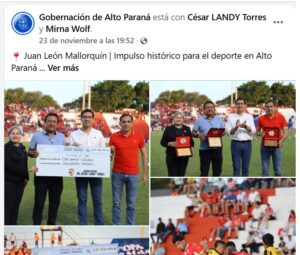 En plena jornada en que General Caballero y el Club Guaraní están disputando un gran encuentro, el gobernador Ing. César “Landy” Torres entregó un aporte histórico de 600 millones de guaraníes al club mallorquino, destinado a su futuro Complejo de Alto Rendimiento.