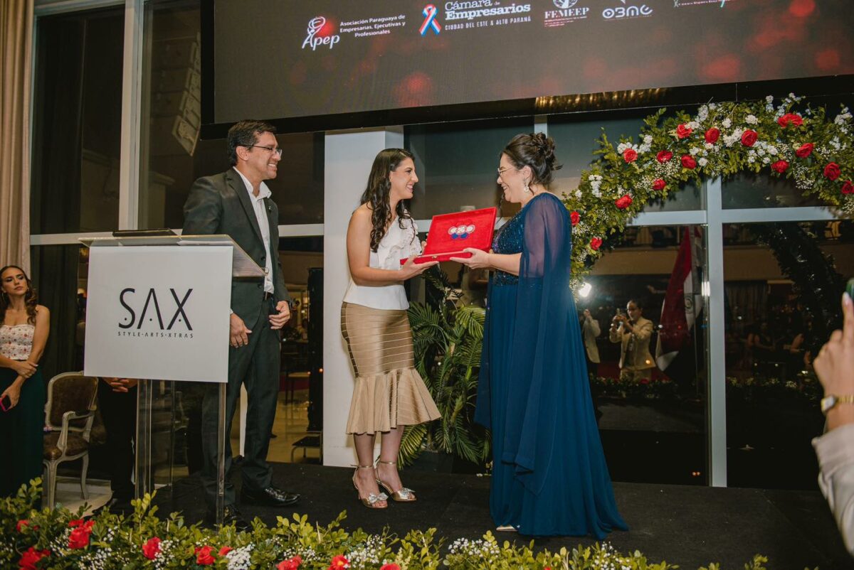 Durante la noche, las autoridades hicieron entrega de un reconocimiento especial a la Ing. Lorena Iglesias, representante de Marlo, por su aporte al fortalecimiento del liderazgo femenino, el emprendedurismo y el desarrollo económico y social del departamento.