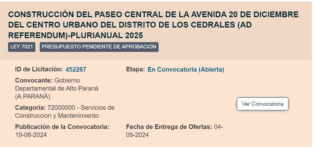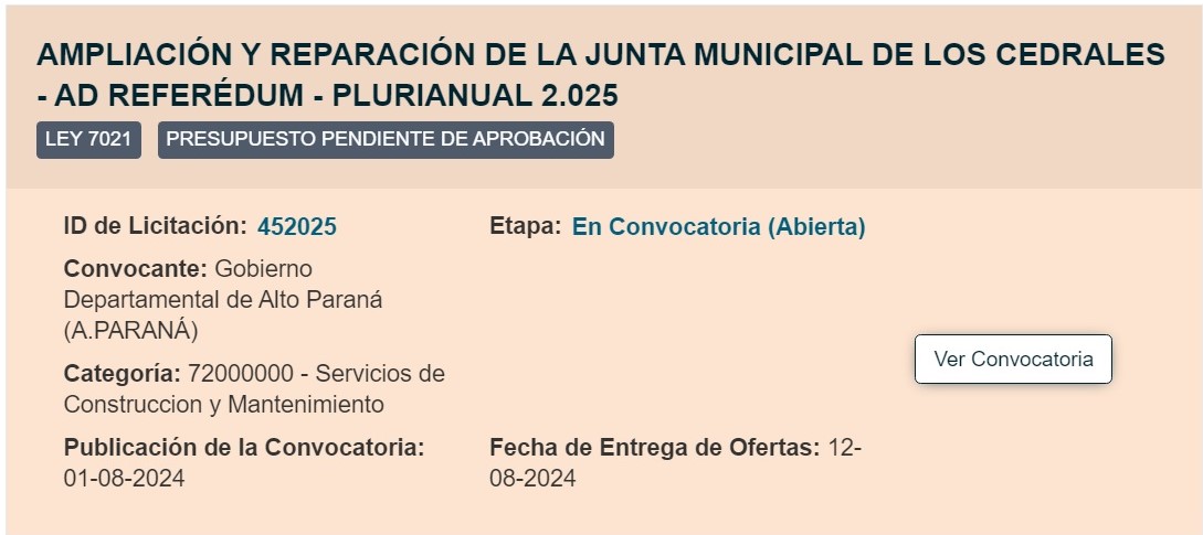 El gobernador de Alto Paraná, César Landy Torres, inició el proceso de licitación de 5 obras sin planificación, sin presupuesto aprobado, y son para 2025. De estas cinco solo dos son para uso público, y tres son edificios para instituciones estatales. Hasta el momento no se hizo ninguna obra con el presupuesto de 2024. Esto es el triste ejemplo de la desastrosa gestión de Landy Torres, y de la completa inoperancia de la Unidad Operativa de Contrataciones (UOC) a cargo de la cuestionada Marilyn Jiménez Peña.