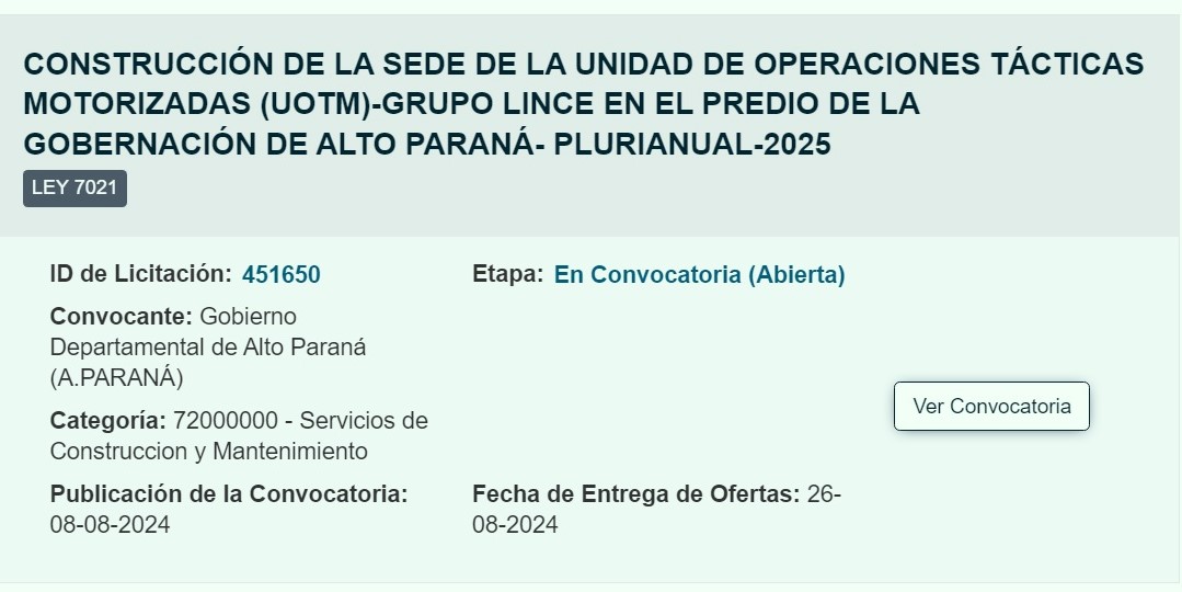 Son para el grupo Lince de la policía nacional. Será su sede propia. La obra se edificará en el predio de la Gobernación de Alto Paraná donde cada vez hay menos espacio físico. En el portal de Contrataciones Públicas se indica que la licitación es sin planificación alguna, y que el presupuesto debe ser aún aprobado.