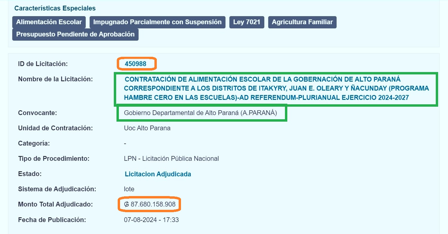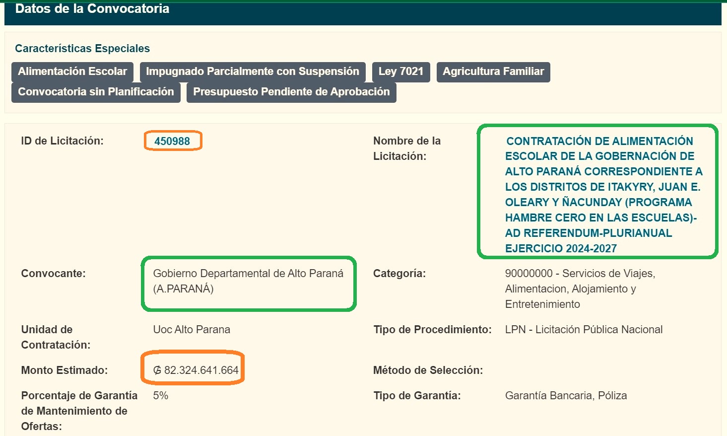 El proceso de compra de alimentos para escolares dentro del programa «Hambre Cero» que realiza el gobernador de Alto Paraná, César Landy Torres, comenzó con un monto de G. 82.324 millones. Pero luego aumentó a G. 87.680 millones. Esto sería para manipular el proceso de licitación, aunque oficialmente se menciona que el monto destinado fue modificado en más de 5 mil millones de guaraníes. Pero todo esto es irregular, y no hay una explicación por parte de la Gobernación.