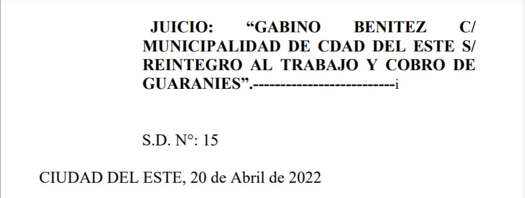 El funcionario Gabino Benítez, bajo patrocinio del abogado Braulio Duarte, demostró que el mismo se desempeñaba como funcionario (guardia de seguridad) de la comuna desde enero del 2006, y tras 13 años de trabajo ininterrumpido en enero el 2020 al presentarse a su cumplir su actividad laboral en su horario habitual, encontró a otro funcionario quien le menciono verbalmente que él había sido despedido y a pesar de buscar explicaciones con su jefe de sección y la dirección de recursos humanos no recibió ninguna respuesta, salvo la prohibición de acercarse a su puesto laboral.