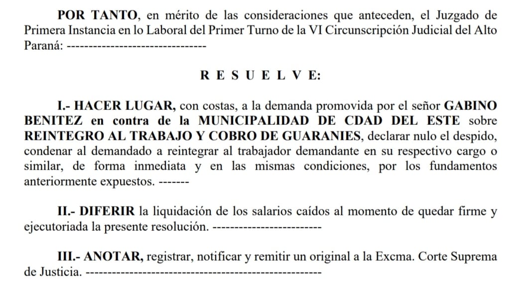 La jueza en lo laboral Graciela Panza condeno a la Municipalidad de Ciudad del Este, a reintegrar a un funcionario con más de 13 años de antigüedad quien fue despedido sin motivo, tras recibir de manera informal solo una indicación verbal de su desvinculación. Debido a la ineptitud de la Asesoría Jurídica, la comuna también fue condenada a pagar los salarios caídos y las costas del juicio.