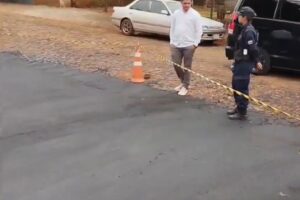 Para que nadie se atreva a pisar o circular por el nuevo asfalto, la intendente interina llevó a funcionarios de la Policía Municipal de Tránsito para que cierren la vía pública y no permitan que nadie entre allí hasta que ella autorice.