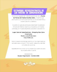 Por este medio, informamos que la conferencia de prensa originalmente prevista no se llevará a cabo en el formato tradicional. En su lugar, utilizaremos el mismo espacio para realizar una grabación tipo podcast, con el objetivo de generar cápsulas de contenido que serán pregrabadas, editadas y difundidas de manera progresiva con información relevante sobre el evento Ecofest.
