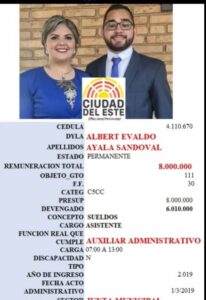 Albert Evaldo Ayala Sandoval, esposo de la intendente interina, quien ya recibía un sueldo millonario como auxiliar administrativo, siendo él enfermero. Recibió una ayuda social de Miguel Prieto Vallejos, poco antes de dejar el cargo por corrupto. El propio ex jefe comunal dijo que tanto María Portillo como su esposo Albert Evaldo eran indigentes para justificar el desembolso de 20 millones de guaraníes.