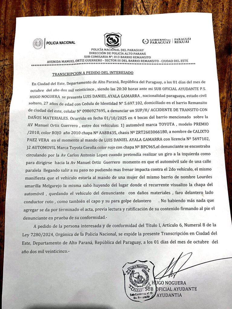 El denunciante, Luis Daniel Ayala Gamarra (27), quien conducía un Toyota Premio de color rojo, relató que el choque se produjo en la Avenida Manuel Ortiz Guerrero. Ayala Gamarra intentaba realizar un giro a la izquierda desde la Avenida Carlos Antonio López, cuando un segundo vehículo, un Toyota Corolla rojo con chapa BPC965, salió repentinamente de una calle paralela, impactando contra él.