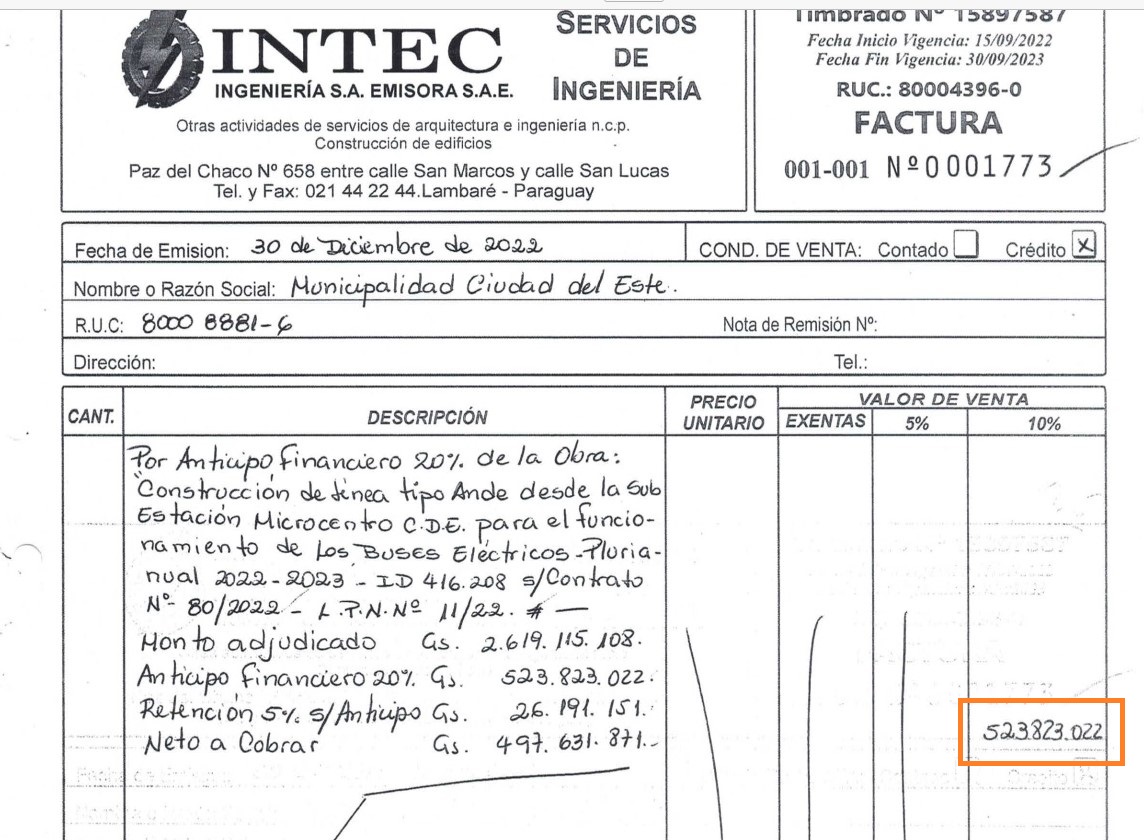 El 24 de enero de 2023, se dio la orden de inició de las obras para la construcción de línea tipo ANDE desde la subestación microcentro CDE para el funcionamiento de los buses eléctricos. La firma Intec, recibió más de 500 millones de guaraníes, pero de los cuatros ítems, solo uno se hizo y el resto.