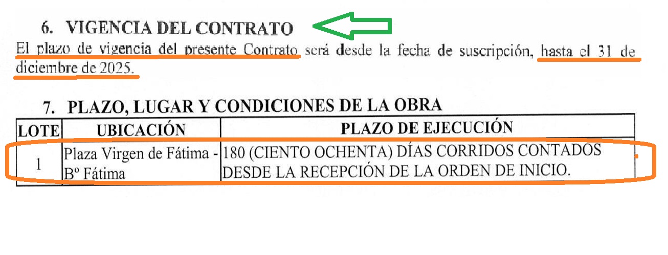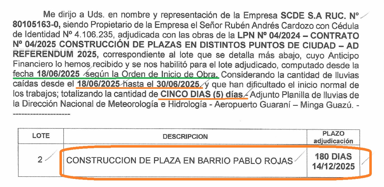 En los contratos firmados por Prieto con las empresas adjudicadas a “dedo” se establece como plazo máximo para entregar las obras 100% terminadas el 14 de diciembre de 2025. Entre las firmas adjudicadas, algunas conocidas por ser usadas para los negociados, como ser Elián Construcciones, vinculado a los liberales; Emprendimientos San Francisco S.A., del seccionalero, sociopolítico de Prieto, Abundio López; y la firma SCDE Sociedad Anónima, el burle que se convirtió en constructora que es o era propiedad de Lili Benítez, la pareja del amigo personal y socio comercial de Prieto, Carlos Giussepe Espinoza Vega, de Aposta. La