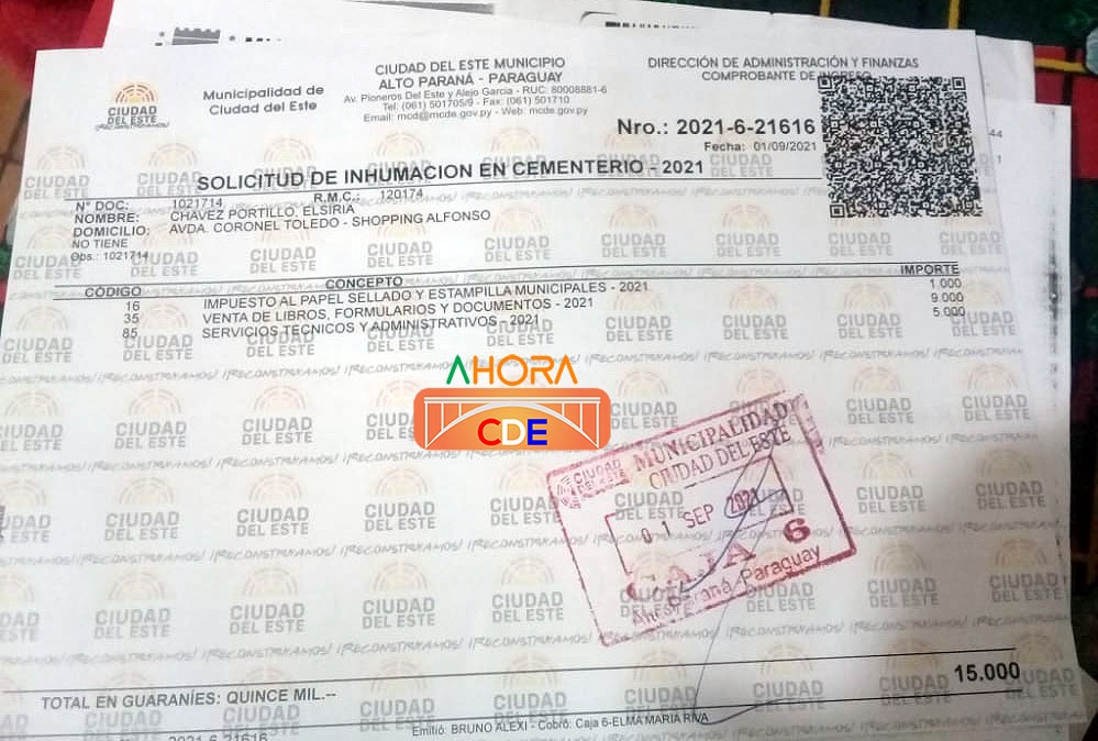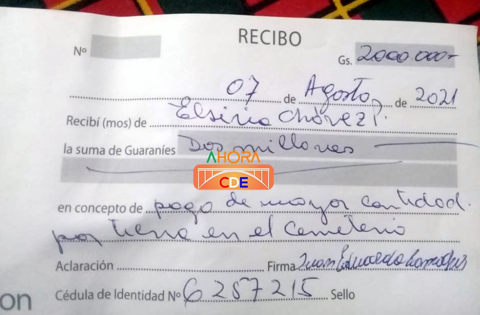 Un caso concreto de venta de un espacio en columbario es la que vendieron a Elsiria Chávez. La persona pago 2 millones de guaraníes para que le consigan un espacio el cementerio y Juan Eduardo Camacho, firmo por el recibo. El monto final del espacio está en 6 millones de guaraníes.