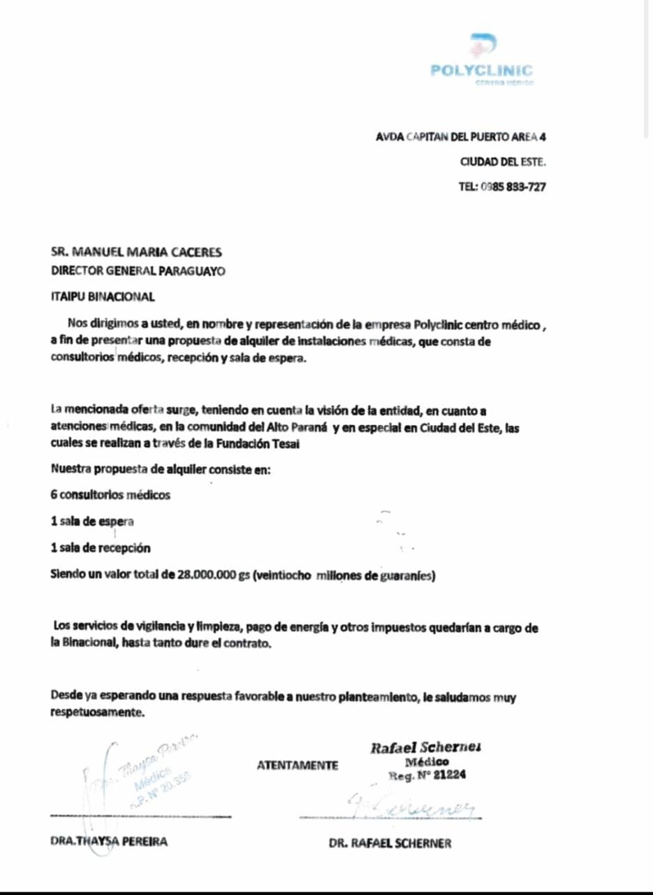 Aunque no se informó cuanto pago la Fundación Tesai por los tres meses de alquiler a “PolyClinic”, pero ahora están pidiendo la suma de 28 millones de guaraníes por mes además exigen que la Fundación pague todos los impuestos.