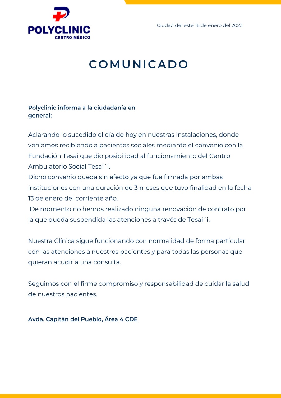 Un comunicado de PolyClinic, publicado en las redes sociales de la doctora Thaysa, dice que el acuerdo de arrendamiento feneció y por eso ya no funciona la policlínica social.