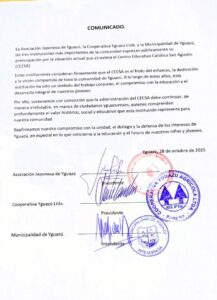 Los padres de familia, la Asociación Japonesa y otras organizaciones del distrito de Yguazú han expresado su rechazo a las negociaciones que se vienen dando entre los directivos del Colegio Católico San Agustín y una universidad privada. Hubo conversaciones con la comunidad, pero no se llegó a un acuerdo. Las reuniones siguen para tratar el tema y, en caso de no prosperar, los yguazuenses advierten que plantearán la revocatoria de donación del predio de 2 hectáreas, ubicado en el casco urbano del distrito.