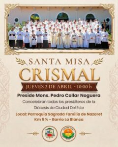 La Diócesis de Ciudad del Este invita a todos los fieles a participar de una de las celebraciones más significativas del año litúrgico: la Santa Misa Crismal.