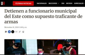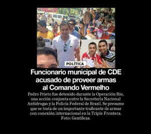 La operación policial más letal de la historia del Brasil fue una mega operación para frenar el avance del Comando Vermelho (CV) en Río de Janeiro. Fue destaque internacional. Son al menos 130 muertos. Se incautaron un gran arsenal de armamentos. Y recuerdan quien era uno de los proveedores de armas a dicha facción criminal brasileña desde Ciudad del Este. Pedro César Prieto, funcionario municipal, primo del entonces intendente, Miguel Prieto Vallejos, destituido por corrupto. Toda la información sobre el traficante de armas que operaba en la Intendencia Municipal fue de la Policía Federal y quien cumplió la orden de detención fue la SENAD.