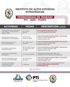 El inicio de clases se encuentra previsto para el mes de junio del 2026 y, al igual que el año pasado, los postulantes deberán pasar por un riguroso proceso de selección. Los requisitos de postulación, la documentación exigida y el procedimiento de preinscripción correspondientes a los tres programas académicos se encuentran disponibles y actualizados en el sitio web oficial del PTI-PY, en el enlace https://www.pti.org.py/iaee/.