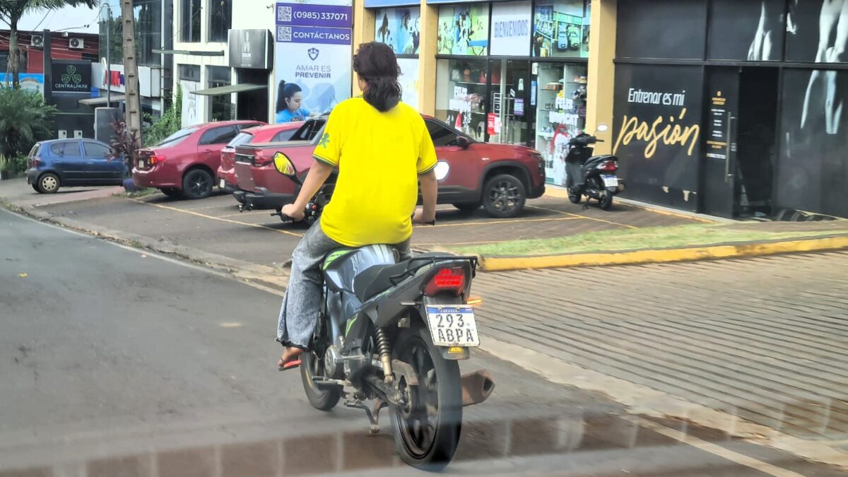 Una joven usaba el tanque de su moto como asiento por un largo tramo en la zona urbana de Ciudad del Este. Todo indica que el rodado tuvo un pinchazo en la rueda trasera. Pero es sumamente irresponsable andar de esta manera, atendiendo a que no tiene el control completo del biciclo con chapa 293 ABPA. Tampoco lleva puesto el casco. Pero esto no es algo aislado, se ve con mucha frecuencia en las calles.