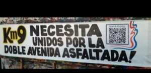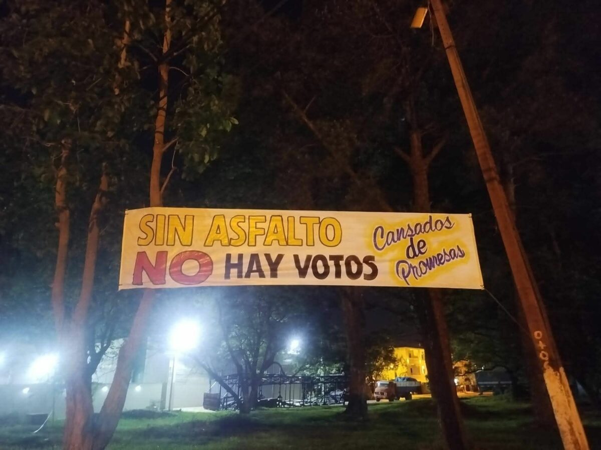 El pasacalle colocado por pobladores del km 9 Acaray generó gran repercusión este lunes 20. En él, los vecinos expresan de forma clara y directa su descontento ante la falta de obras viales en la zona, con un mensaje que no deja lugar a dudas: “Si no hay asfalto, no hay votos”.